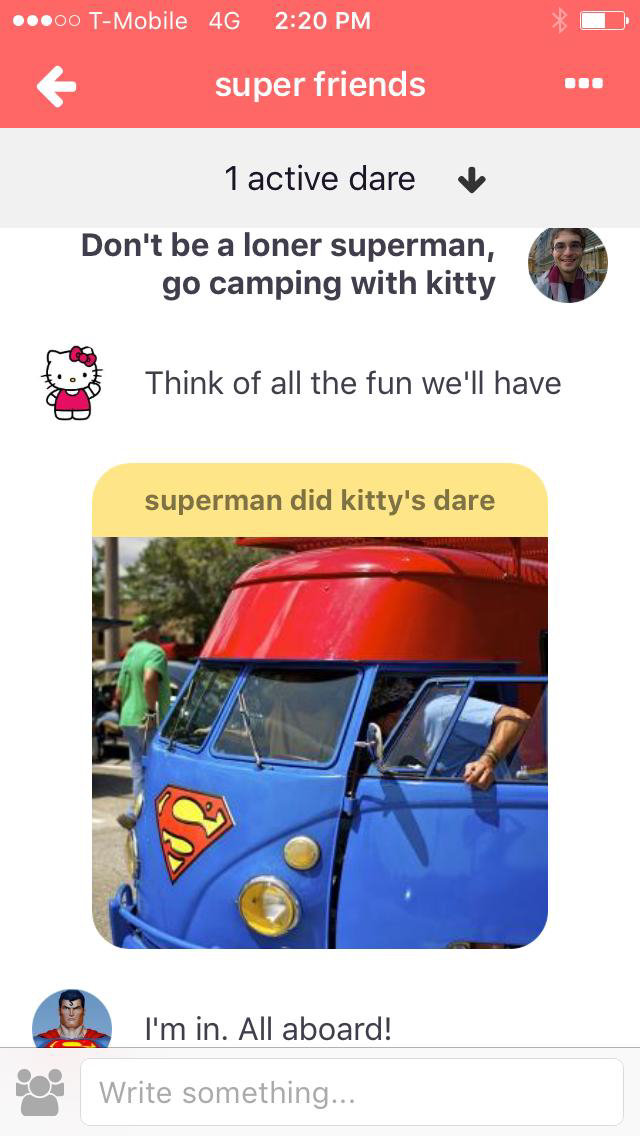 Share your videos of completed dares with your followers and look at what others have shared.