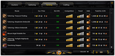 For this you have to just a click a button to “scan” the auction house and Tycoon will find items which are on high demand and low competition, i.e. have a great profit margin. Thus you can understand exactly which items to pick, to make most of the gold. Next Tycoon shows you gathering routes, maps, farming locations etc in the game that will enable you to get just those items within the fastest possible time.